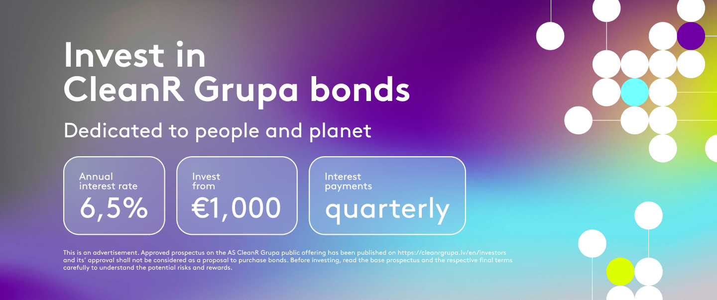 In its first public bond offering, to be held from 29 October to 11 November, the Group plans to raise up to EUR 15 million, as part of a bond programme totalling up to EUR 50 million. With each bond having a nominal value of €1,000. The base prospectus of the AS CleanR Grupa bond programme has been approved by the Bank of Latvia.